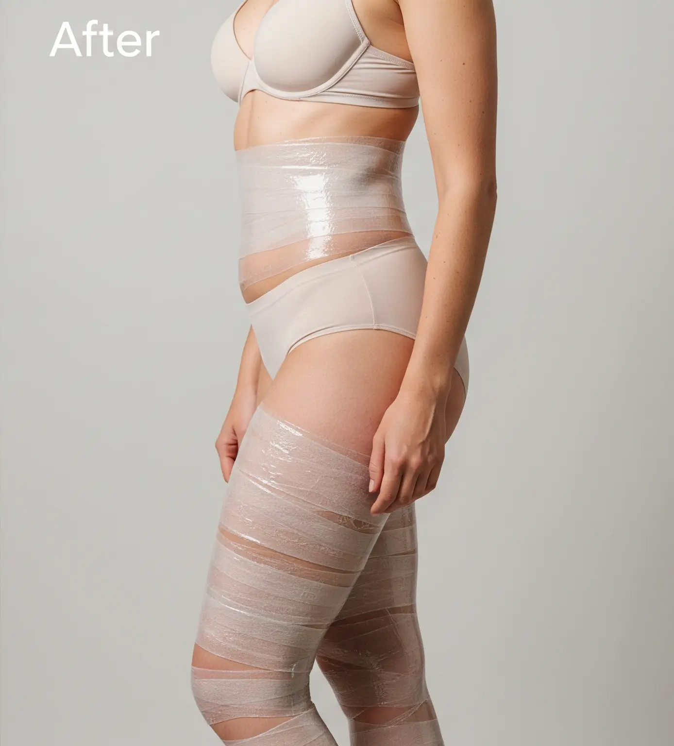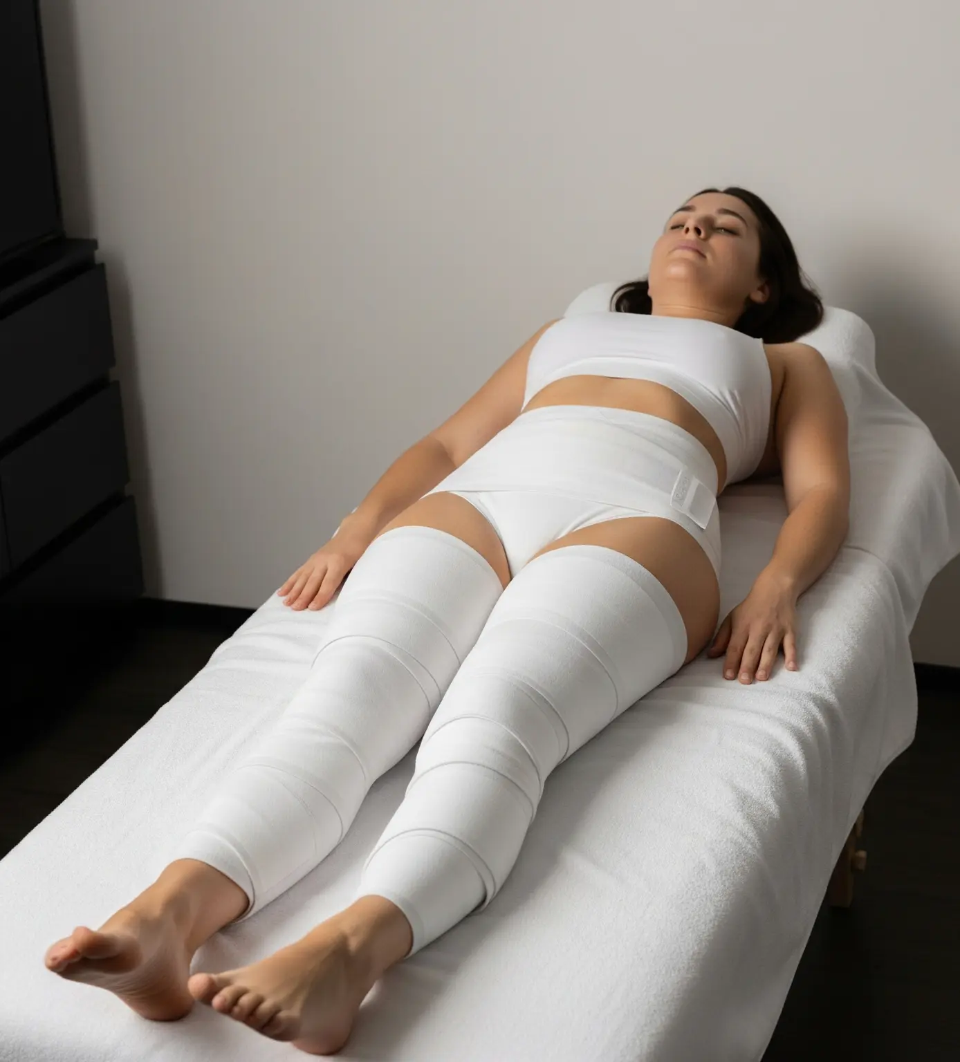 O produto é cuidadosamente aplicado e o corpo é envolvido para potenciar o efeito térmico.